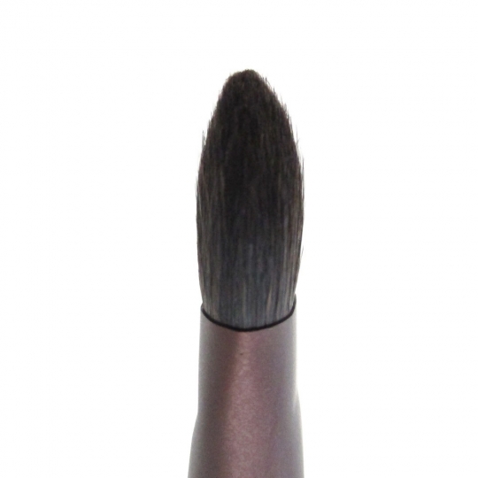 - まぶたは、皆様、御存じだと思いますがお顔の中でも一番皮膚が薄いところです。ごわごわした、人工毛をお使いの皆様、一度このブラシをお使いください。灰リスが基本ベースになっているので、非常にソフトです。ただソフトだけでは、カラーが取りづらく、ここで、職人が考えたのが、腰のある『ウマ毛』をブレンドすることで、カラーを取りやすくしました。さらに、考え出されたのが、毛を短くすることです。灰リスの風格を損なわず、ヤギの特徴を生かす工夫がされたブラシです。