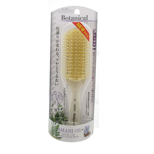 Botanical デュボア AOダメージケアブラシ 植物由来のアマニオイルから。うるおいとツヤ・自然な髪に。アマニオイル配合液をマイクロカプセル化。ブラシ部にアマニオイル配合液をマイクロカプセル化して樹脂に練り込みました。静電気除去繊維ナスロンを装着。ブラシ部両サイドに除電繊維を装着しています。静電気除去効果は気温、湿度など状況により差があります。
